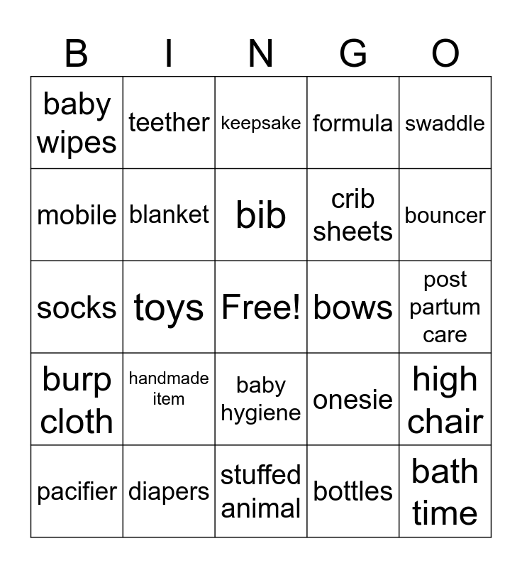 This bingo card has a free space and 24 words: handmade item, diapers, bib, pacifier, swaddle, baby wipes, mobile, teether, bows, baby hygiene, crib sheets, socks, onesie, high chair, blanket, bottles, post partum care, keepsake, bouncer, toys, bath time, burp cloth, formula and stuffed animal.