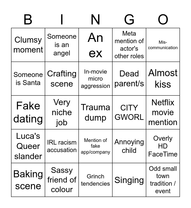 This bingo card has a free space and 24 words: IRL racism accusation, Sassy friend of colour, In-movie micro aggression, Baking scene, Mis- communication, Clumsy moment, Someone is Santa, Someone is an angel, CITY GWORL, Mention of fake app/company, Dead parent/s, Fake dating, Annoying child, Overly HD FaceTime, Crafting scene, Singing, Netflix movie mention, An ex, Almost kiss, Very niche job, Odd small town tradition / event, Luca's Queer slander, Meta mention of actor's other roles and Grinch tendencies.