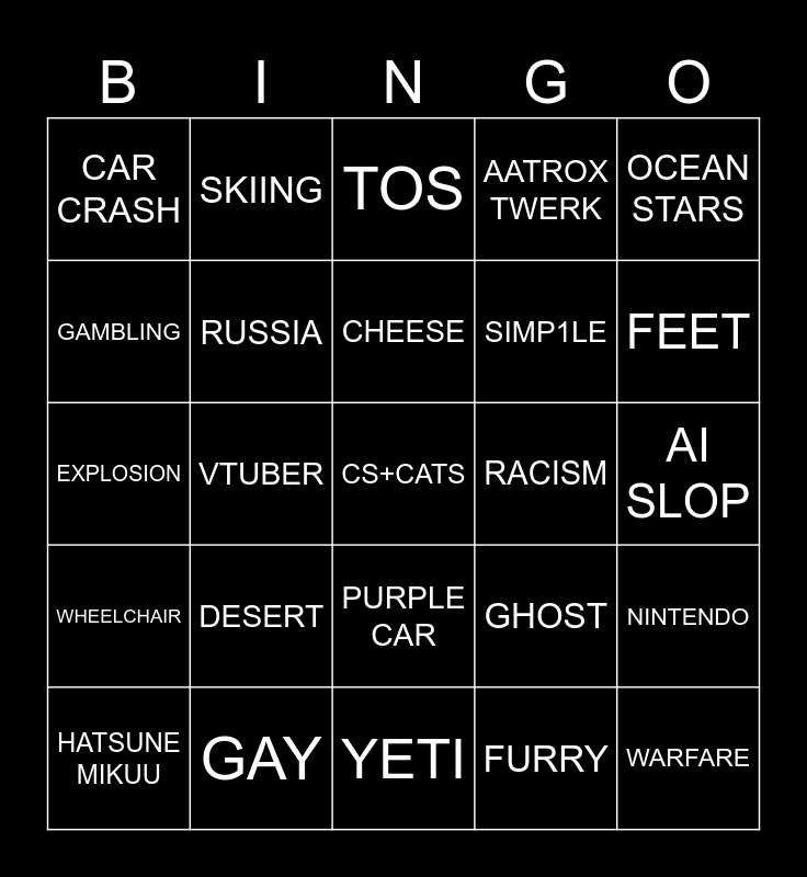 This bingo card has a free space and 24 words: DESERT, GAY, CHEESE, HATSUNE MIKUU, OCEAN STARS, CAR CRASH, GAMBLING, SKIING, RACISM, PURPLE CAR, SIMP1LE, EXPLOSION, GHOST, NINTENDO, RUSSIA, FURRY, AI SLOP, TOS, FEET, VTUBER, WARFARE, WHEELCHAIR, AATROX TWERK and YETI.