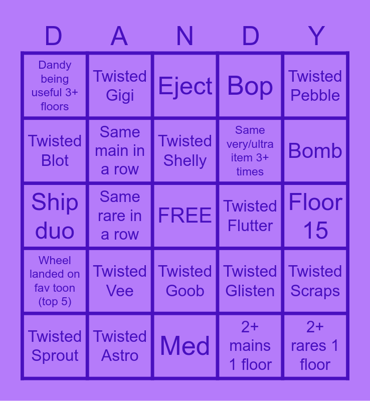 This bingo card has a free space and 24 words: Twisted Vee, Twisted Astro, Twisted Shelly, Twisted Sprout, Twisted Pebble, Dandy being useful 3+ floors, Twisted Blot, Twisted Gigi, Twisted Flutter, Twisted Goob, Same very/ultra item 3+ times, Ship duo, Twisted Glisten, Twisted Scraps, Same main in a row, 2+ mains 1 floor, Floor 15, Eject, Bomb, Same rare in a row, 2+ rares 1 floor, Wheel landed on fav toon (top 5), Bop and Med.