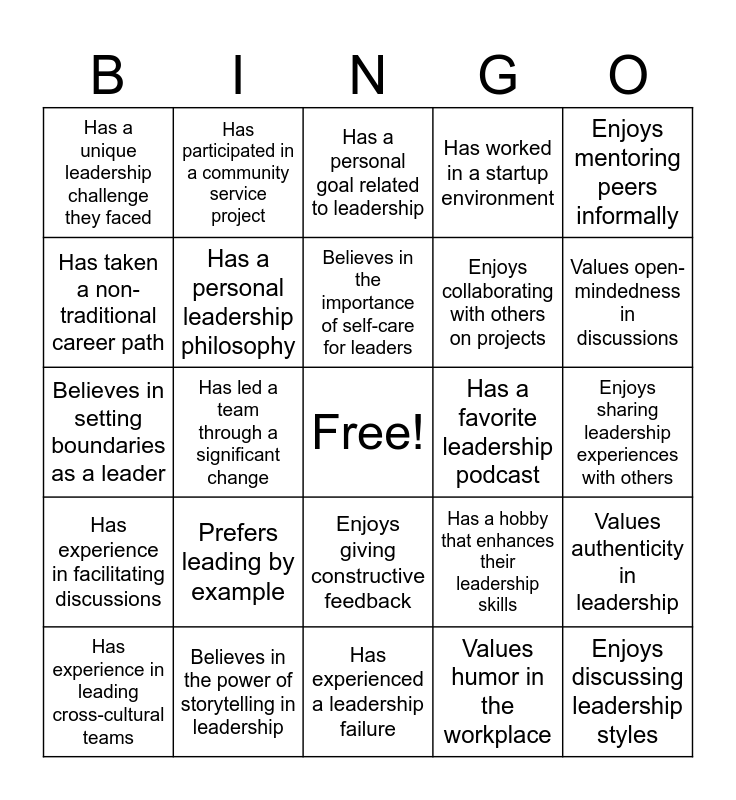 This bingo card has a free space and 50 words: Has taken a unique approach to problem-solving, Enjoys discussing leadership styles, Has a favorite leadership quote, Has experienced a leadership failure, Prefers leading by example, Has a favorite leadership book or author, Has participated in a community service project, Values creativity in leadership, Has taken a non-traditional career path, Enjoys learning from mistakes, Has a personal leadership philosophy, Has worked in a startup environment, Values authenticity in leadership, Has a hobby that enhances their leadership skills, Has traveled for work or study, Has experience in a volunteer leadership role, Believes in the importance of self-care for leaders, Has a favorite leadership podcast, Has taken a course outside their field of expertise, Enjoys mentoring peers informally, Has led a team through a significant change, Values humor in the workplace, Has a unique leadership challenge they faced, Enjoys collaborating with others on projects, Has a favorite team-building activity, Has learned a valuable lesson from a colleague, Values open-mindedness in discussions, Has experience in a different industry, Has a personal goal related to leadership, Enjoys giving constructive feedback, Has a favorite way to celebrate team successes, Values listening as a leadership skill, Has taken part in a leadership simulation, Has experience in leading virtual teams, Believes in the power of storytelling in leadership, Has a favorite quote about teamwork, Has participated in a leadership book club, Values adaptability in leadership, Has experience in leading a diverse group, Enjoys sharing leadership experiences with others, Has a unique perspective on leadership, Has taken a break from leadership roles, Values the importance of trust in teams, Has a favorite leadership-related TED Talk, Has experience in leading cross-cultural teams, Believes in setting boundaries as a leader, Has a personal mantra related to leadership, Enjoys exploring new leadership trends, Has experience in facilitating discussions and Values the role of feedback in personal growth.
