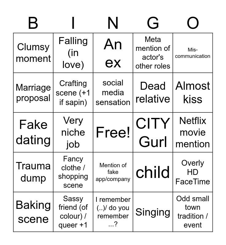 This bingo card has a free space and 24 words: Fancy clothe / shopping scene, Sassy friend (of colour) / queer +1, social media sensation, Baking scene, Mis- communication, Clumsy moment, Marriage proposal, Falling (in love), CITY Gurl, Mention of fake app/company, Dead relative, Fake dating, child, Overly HD FaceTime, Crafting scene (+1 if sapin), Singing, Netflix movie mention, An ex, Almost kiss, Very niche job, Odd small town tradition / event, Trauma dump, Meta mention of actor's other roles and I remember (..)/ do you remember ...?.