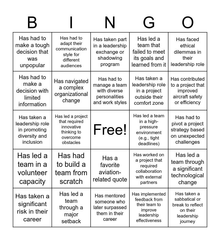 This bingo card has a free space and 55 words: Has led a team through a major crisis, Has taken a significant risk in their career, Has received constructive criticism that changed their approach to leadership, Has had to make a tough decision that was unpopular, Has mentored someone who later surpassed them in their career, Has implemented a new process that significantly improved team performance, Has navigated a complex organizational change, Has had to manage a conflict between team members, Has taken a leadership role in a project outside their comfort zone, Has worked with a difficult stakeholder and turned the relationship around, Has led a team that failed to meet its goals and learned from it, Has had to advocate for their team in a challenging situation, Has taken a leadership role in a cross-functional project, Has had to deliver bad news to their team, Has led a team through a significant transition (e.g., merger, acquisition), Has developed a leadership training program for others, Has faced ethical dilemmas in their leadership role, Has led a project that required innovative thinking to overcome obstacles, Has had to balance competing priorities in a leadership role, Has taken a sabbatical or break to reflect on their leadership journey, Has led a team in a high-pressure environment (e.g., tight deadlines), Has had to change their leadership style to meet team needs, Has worked on a project that required collaboration with external partners, Has taken part in a leadership exchange or shadowing program, Has led a team that was geographically dispersed, Has had to manage a team with diverse personalities and work styles, Has implemented feedback from their team to improve leadership effectiveness, Has taken a leadership role in a community initiative, Has had to pivot a project strategy based on unexpected challenges, Has led a team through a significant technological change, Has had to deal with a team member's performance issues, Has taken a leadership role in a crisis situation, Has had to negotiate a difficult agreement on behalf of their team, Has led a team that achieved a major milestone against the odds, Has had to make a decision with limited information, Has taken a leadership role in promoting diversity and inclusion, Has had to manage their own burnout while leading others, Has led a team in a volunteer capacity, Has had to influence others without formal authority, Has taken part in a leadership retreat or intensive program, Has had to adapt their communication style for different audiences, Has led a project that required significant change management, Has had to mentor someone who was resistant to feedback, Has taken a leadership role in a challenging project with tight resources, Has had to build a team from scratch, Has led a team through a major setback, Has had to advocate for a new idea that was initially rejected, Has taken a leadership role in a professional organization, Has had to manage a team during a period of uncertainty, Has contributed to a project that improved aircraft safety or efficiency, Holds a private pilot's license, Has taken a flight in a commercial airliner’s cockpit, Has participated in a flight simulator experience, Has a favorite aviation-related quote and Has volunteered for an aviation-related charity or organization.