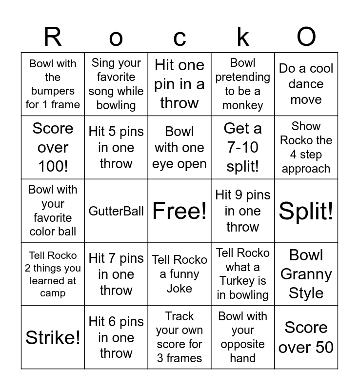 This bingo card has a free space and 29 words: Strike!, Spare, GutterBall, Bowl without the bumpers for 1 frame, Bowl with the bumpers for 1 frame, Hit one pin in a throw, Hit 5 pins in one throw, Hit 7 pins in one throw, Hit 9 pins in one throw, Hit 6 pins in one throw, Split!, Score over 50, Track your own score for 3 frames, Bowl with your opposite hand, Show Rocko the 4 step approach, Roll a 12+ ball, Tell Rocko a funny Joke, Tell Rocko 2 things you learned at camp, Do a cool dance move, Bowl with your favorite color ball, Tell Rocko what a Turkey is in bowling, Give someone a compliment, Get a 7-10 split!, Score over 100!, Bowl pretending to be a monkey, Sing your favorite song while bowling, Bowl Granny Style, Bowl with one eye open and Get 3 strikes as a team!.