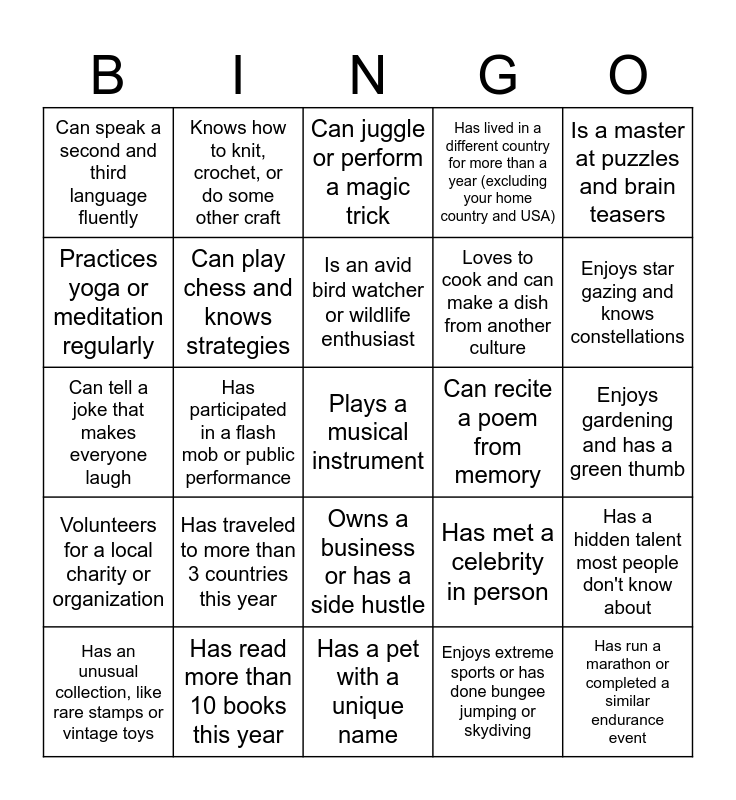 This bingo card has 25 words: Has traveled to more than 3 countries this year, Has a pet with a unique name, Is an avid bird watcher or wildlife enthusiast, Has an unusual collection, like rare stamps or vintage toys, Is a master at puzzles and brain teasers, Can speak a second and third language fluently, Practices yoga or meditation regularly, Knows how to knit, crochet, or do some other craft, Can recite a poem from memory, Owns a business or has a side hustle, Loves to cook and can make a dish from another culture, Can tell a joke that makes everyone laugh, Has met a celebrity in person, Has a hidden talent most people don't know about, Can play chess and knows strategies, Has run a marathon or completed a similar endurance event, Enjoys gardening and has a green thumb, Can juggle or perform a magic trick, Enjoys star gazing and knows constellations, Has participated in a flash mob or public performance, Plays a musical instrument, Has read more than 10 books this year, Volunteers for a local charity or organization, Has lived in a different country for more than a year (excluding your home country and USA) and Enjoys extreme sports or has done bungee jumping or skydiving.