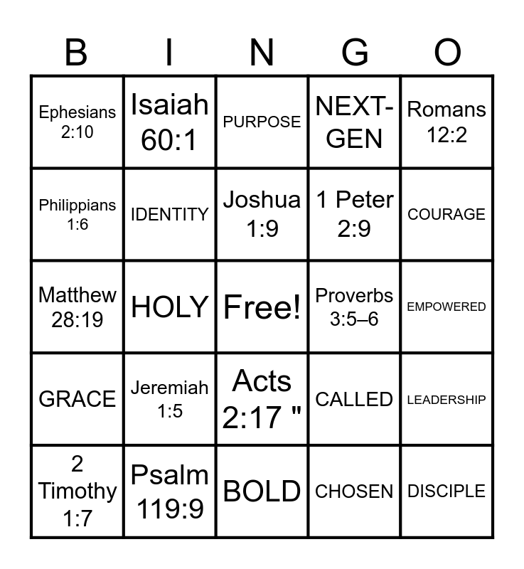 This bingo card has a free space and 24 words: Jeremiah 1:5, Psalm 119:9, Joshua 1:9, 2 Timothy 1:7, Romans 12:2, Ephesians 2:10, Philippians 1:6, Isaiah 60:1, Proverbs 3:5–6, Acts 2:17 ", 1 Peter 2:9, Matthew 28:19, CALLED, LEADERSHIP, IDENTITY, CHOSEN, EMPOWERED, PURPOSE, COURAGE, HOLY, DISCIPLE, GRACE, NEXT-GEN and BOLD.