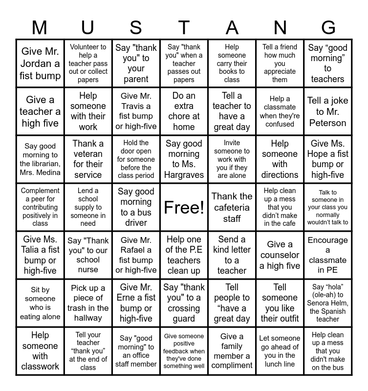 This bingo card has a free space and 48 words: Tell people to “have a great day, Help a classmate when they're confused, Give someone positive feedback when they've done something well, Lend a school supply to someone in need, Hold the door open for someone before the class period, Talk to someone in your class you normally wouldn’t talk to, Volunteer to help a teacher pass out or collect papers, Tell your teacher “thank you” at the end of class, Tell a friend how much you appreciate them, Help one of the P.E teachers clean up, Say “good morning” to teachers, Say "thank you" when a teacher passes out papers, Help someone with directions, Invite someone to work with you if they are alone, Sit by someone who is eating alone, Help clean up a mess that you didn’t make in the cafe, Give a teacher a high five, Tell a joke to Mr. Peterson, Tell someone you like their outfit, Help someone carry their books to class, Tell a teacher to have a great day, Say good morning to a bus driver, Give Mr. Jordan a fist bump, Help someone with their work, Say “hola” (ole-ah) to Senora Helm, the Spanish teacher, Give Mr. Travis a fist bump or high-five, Give Ms. Hope a fist bump or high-five, Help someone with classwork, Say good morning to Ms. Hargraves, Thank a veteran for their service, Let someone go ahead of you in the lunch line, Thank the cafeteria staff, Encourage a classmate in PE, Pick up a piece of trash in the hallway, Complement a peer for contributing positively in class, Send a kind letter to a teacher, Give a counselor a high five, Say good morning to the librarian, Mrs. Medina, Give Mr. Rafael a fist bump or high-five, Give Mr. Erne a fist bump or high-five, Give Ms. Talia a fist bump or high-five, Help clean up a mess that you didn't make on the bus, Say "thank you" to your parent, Say "good morning" to an office staff member, Do an extra chore at home, Say "thank you" to a crossing guard, Say "Thank you" to our school nurse and Give a family member a compliment.