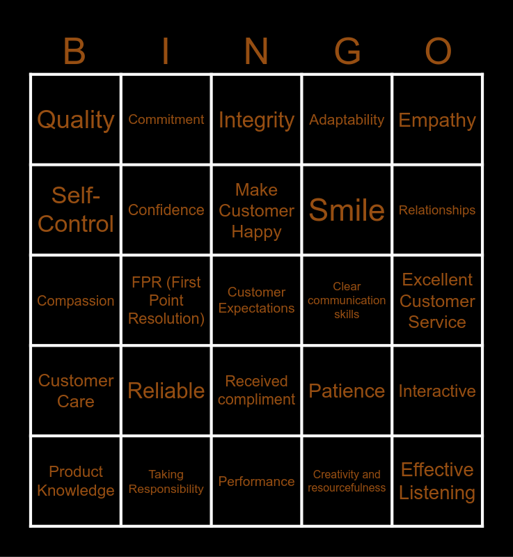 This bingo card has a free space and 33 words: Positive, Attentiveness, FPR (First Point Resolution), Smile, Customer Care, Confidence, Empathy, Product Knowledge, Commitment, Malaysia Greetings, Make Customer Happy, Integrity, Sympathy, Teamwork, Clear communication skills, Relationships, Taking Responsibility, Compassion, Reliable, Patience, Received compliment, Customer Satisfaction, Quality, Excellent Customer Service, Performance, Effective Listening, Adaptability, Smile, Self-Control, Interactive, Emotional intelligence, Creativity and resourcefulness and Friendly Attitude.