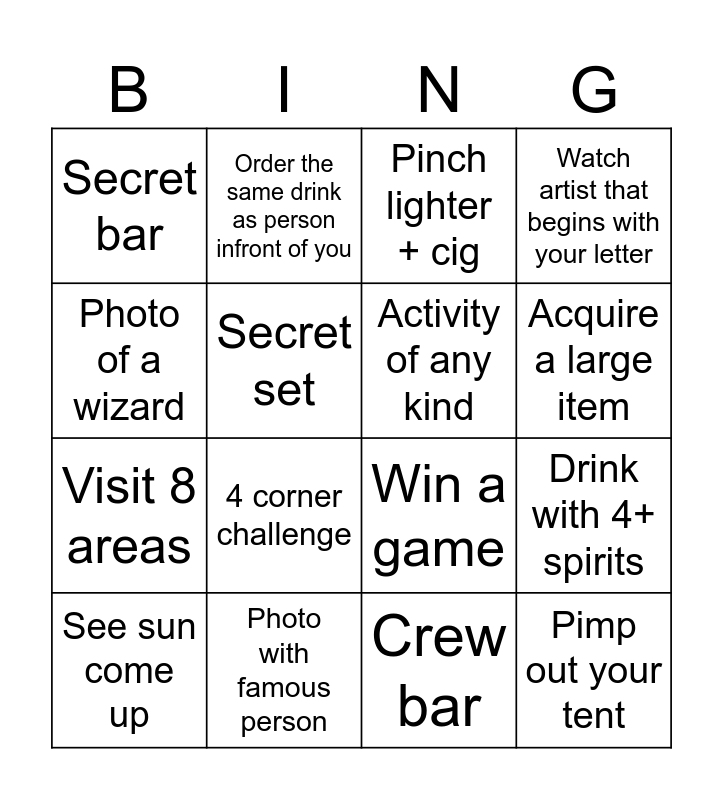 This bingo card has 22 words: Photo with famous person, Visit your given stage, Order the same drink as person infront of you, Photo of someone wearing your hat, Secret set, Activity of any kind, Secret bar, Pinch lighter + cig, Win a game, Pimp out your tent, Visit 8 areas, Watch artist that begins with your letter, Meet someone you know, New accessory, Crew bar, 4 wristbands, Drink with 4+ spirits, See sun come up, 4 corner challenge, Photo of a wizard, Acquire a large item and Backpack warrior.