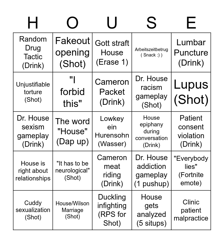 This bingo card has a free space and 24 words: "It has to be neurological" (Shot), House/Wilson Marriage (Shot), Cameron Packet (Drink), Cuddy sexualization (Shot), Lumbar Puncture (Drink), Random Drug Tactic (Drink), Unjustifiable torture (Shot), Fakeout opening (Shot), House epiphany during conversation (Drink), Cameron meat riding (Drink), Dr. House racism gameplay (Shot), Dr. House sexism gameplay (Drink), Dr. House addiction gameplay (1 pushup), "Everybody lies" (Fortnite emote), "I forbid this", House gets analyzed (5 situps), Patient consent violation (Drink), Gott straft House (Erase 1), Lupus (Shot), The word "House" (Dap up), Clinic patient malpractice, House is right about relationships, Arbeitszeitbetrug ( Snack :) ) and Duckling infighting (RPS for Shot).