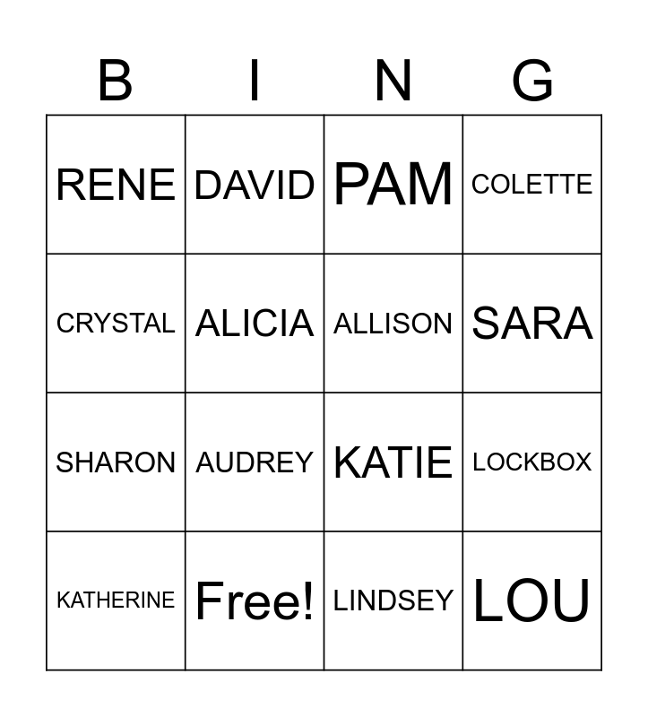This bingo card has 21 words: Free!, CARRIE, DAVID, SUSIE, LINDSEY, ALLISON, RENE, PAM, KATIE, SARA, SHARON, COLETTE, LOU, ASHTON, ALICIA, MARIA, KATHERINE, AUDREY, CRYSTAL, LOCKBOX and JAYLANE.
