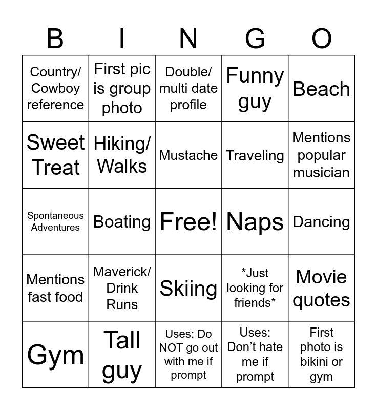 This bingo card has a free space and 24 words: Maverick/ Drink Runs, Tall guy, Mustache, Gym, Beach, Country/ Cowboy reference, Sweet Treat, First pic is group photo, Naps, Skiing, Traveling, Spontaneous Adventures, *Just looking for friends*, Movie quotes, Hiking/ Walks, Uses: Don’t hate me if prompt, Dancing, Double/ multi date profile, Mentions popular musician, Boating, First photo is bikini or gym, Mentions fast food, Funny guy and Uses: Do NOT go out with me if prompt.