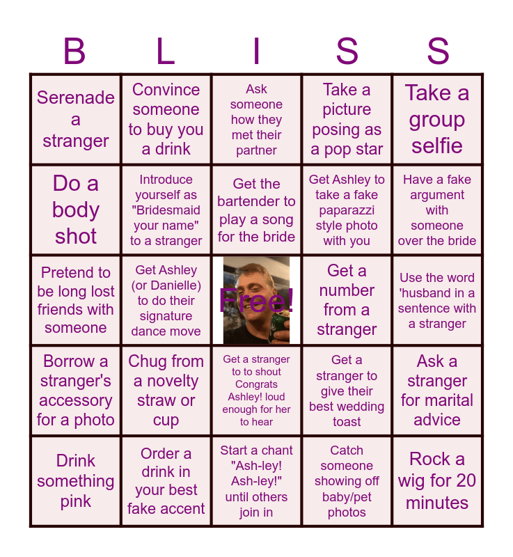This bingo card has a free space and 24 words: Chug from a novelty straw or cup, Order a drink in your best fake accent, Get the bartender to play a song for the bride, Drink something pink, Take a group selfie, Serenade a stranger, Do a body shot, Convince someone to buy you a drink, Get a number from a stranger, Get a stranger to to shout Congrats Ashley! loud enough for her to hear, Get Ashley to take a fake paparazzi style photo with you, Pretend to be long lost friends with someone, Get a stranger to give their best wedding toast, Ask a stranger for marital advice, Introduce yourself as "Bridesmaid your name" to a stranger, Catch someone showing off baby/pet photos, Use the word 'husband in a sentence with a stranger, Ask someone how they met their partner, Have a fake argument with someone over the bride, Get Ashley (or Danielle) to do their signature dance move, Rock a wig for 20 minutes, Borrow a stranger's accessory for a photo, Take a picture posing as a pop star and Start a chant "Ash-ley! Ash-ley!" until others join in.