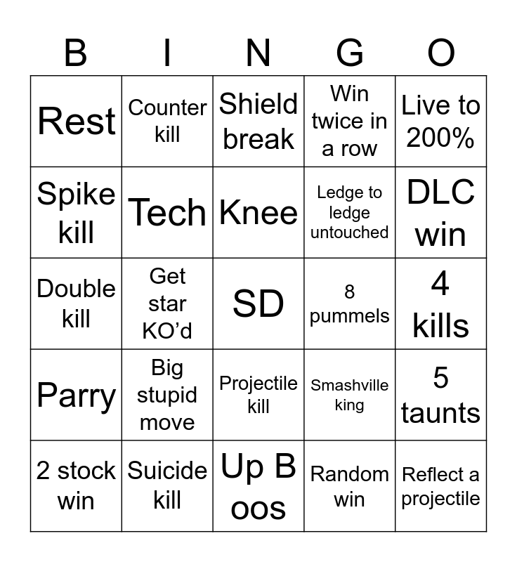 This bingo card has a free space and 24 words: Big stupid move, Suicide kill, Knee, 2 stock win, Live to 200%, Rest, Spike kill, Counter kill, 8 pummels, Projectile kill, Ledge to ledge untouched, Double kill, Smashville king, 5 taunts, Tech, Random win, 4 kills, Shield break, DLC win, Get star KO’d, Reflect a projectile, Parry, Win twice in a row and Up B oos.