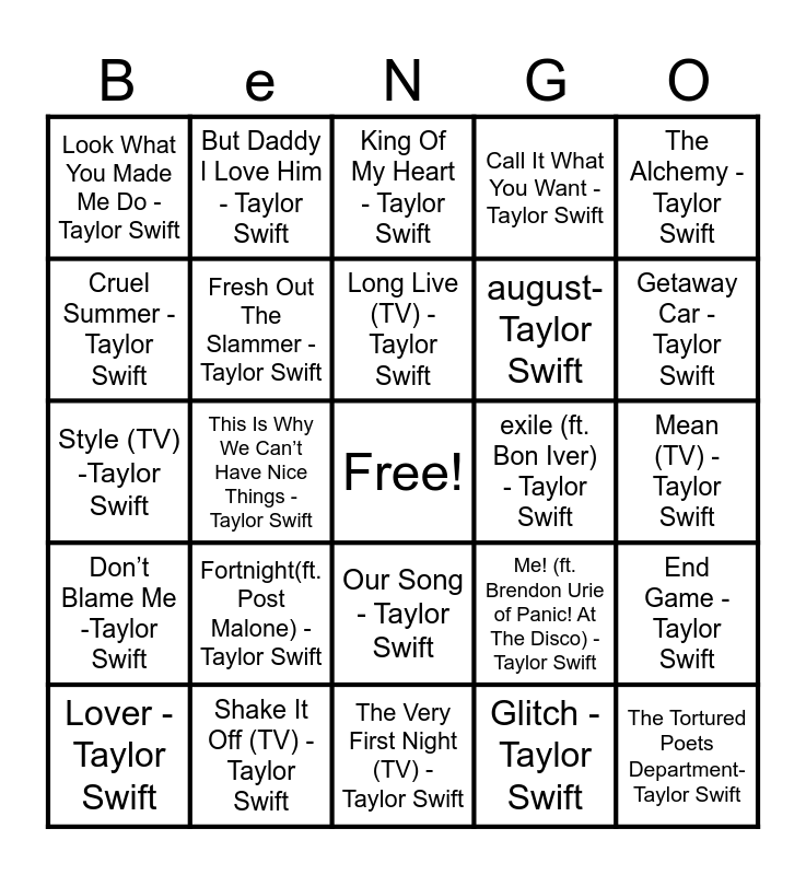 This bingo card has a free space and 90 words: Tim McGraw - Taylor Swift, Picture To Burn - Taylor Swift, Our Song - Taylor Swift, Fearless (TV) - Taylor Swift, Hey Stephen (TV) -Taylor Swift, Mr.Perfectly Fine - (TV) -Taylor Swift, You Belong With Me (TV) - Taylor Swift, Love Story (TV) - Taylor Swift, Speak Now (TV) - Taylor Swift, Sparks Fly (TV) - Taylor Swift, Mine (TV) - Taylor Swift, Never Grow Up (TV) - Taylor Swift, The Story Of Us (TV) - Taylor Swift, Mean (TV) - Taylor Swift, Enchanted (TV) - Taylor Swift, Long Live (TV) - Taylor Swift, Red (TV) - Taylor Swift, I Knew You Were Trouble (TV) - Taylor Swift, Babe (TV) - Taylor Swift, We Are Never Getting Back Together (TV) -Taylor Swift, 22 (TV) -Taylor Swift, Girl At Home (TV) - Taylor Swift, The Very First Night (TV) -Taylor Swift, Blank Space (TV) - Taylor Swift, Style (TV) -Taylor Swift, Shake It Off (TV) -Taylor Swift, All You Had To Do Was Stay (TV) - Taylor Swift, Wildest Dream (TV) - Taylor Swift, New Romantics (TV) -Taylor Swift, Is It Over Now? (TV) - Taylor Swift, …Ready For It? -Taylor Swift, End Game -Taylor Swift, I Did Something Bad -Taylor Swift, Don’t Blame Me -Taylor Swift, Look What You Made Me Do - Taylor Swift, Call It What You Want - Taylor Swift, King Of My Heart - Taylor Swift, Gorgeous - Taylor Swift, This Is Why We Can’t Have Nice Things - Taylor Swift, Getaway Car - Taylor Swift, Lover - Taylor Swift, Cruel Summer - Taylor Swift, Death By A Thousand Cuts - Taylor Swift, London Boy - Taylor Swift, You Need To Calm Down - Taylor Swift, Me! (ft. Brendon Urie of Panic! At The Disco) - Taylor Swift, I Forgot That You Existed - Taylor Swift, I Think He Knows - Taylor Swift, Daylight - Taylor Swift, Afterglow - Taylor Swift, False God - Taylor Swift, august- Taylor Swift, illicit affairs - Taylor Swift, the 1 - Taylor Swift, my tears ricochet - Taylor Swift, this is me trying - Taylor Swift, exile (ft. Bon Iver) - Taylor Swift, the lakes - bonus track - Taylor Swift, champagne problems- Taylor Swift, willow - Taylor Swift, tolerate it - Taylor Swift, gold rush - Taylor Swift, Anti-Hero - Taylor Swift, Karma - Taylor Swift, Bejeweled - Taylor Swift, Paris - Taylor Swift, Maroon - Taylor Swift, Glitch - Taylor Swift, Dear Reader - Taylor Swift, Hits Different- Taylor Swift, Fortnight(ft. Post Malone) - Taylor Swift, The Tortured Poets Department- Taylor Swift, My Boy Only Breaks His Favorite Toys - Taylor Swift, Down Bad - Taylor Swift, But Daddy I Love Him - Taylor Swift, Fresh Out The Slammer - Taylor Swift, Florida!!! - (ft. Florence + The Machine) - Taylor Swift, Guilty as Sin? - Taylor Swift, Who’s Afraid Of Little Old Me? - Taylor Swift, I Can Do It With A Broken Heart - Taylor Swift, The Smallest Man Who Ever Lived - Taylor Swift, The Alchemy - Taylor Swift, imgonnagetyouback - Taylor Swift, So High School - Taylor Swift, I Hate It Here - Taylor Swift, I Look In People’s Windows- Taylor Swift, The Prophecy - Taylor Swift, Cassandra- Taylor Swift, The Bolter - Taylor Swift and The Albatross- Taylor Swift.