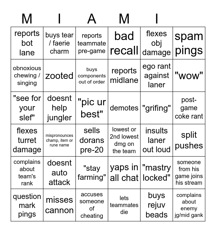 This bingo card has 71 words: ap nasus (ap build on ad champ), buys tear / faerie charm, bad ignite, buys rejuv beads, insults laner out loud, bad flash, bad recall, goes oom in lane, buys components out of order, sells components, sells dorans pre-20, reports jungler, reports midlane, reports bot lane, "drako", ego rant against laner, flexes turret damage, flexes obj damage, Free (-27 LP)!, "pic ur best", "grifing", "see for your slef", mispronounces champ, item or rune name, yaps in all chat, question mark pings, weird soundbite, complains about mid laner not rotating, complains about no ganks, misses cannon, "let's take a gander / look", lowest or 2nd lowest dmg on the team, flexes vision score, takes berries while full hp/mana, accuses teammate of cheating, split pushes, lets teammates die, calls someone a slur (or something vulgar), dies and cries, spam pings, someone from his game joins his stream, post-game coke rant, complains about team's rank, demotes, complains about objectives, low/no deaths (to flex his kda), "mastry locked", "you new?", obnoxious chewing / singing, "look at this __", complains about enemy jg/mid gank, lost grubs fight, reports bot lane, doesnt help jungler, doesnt auto attack, takes jungle camps pre 1200 smite, thinks hes faker, zooted, spam emotes, actual good play, "big damage", takes a bad fight, marathon training, "wow", ignores / reads chat message late, "they duos", accuses someone of cheating, reports teammate pre-game, complains about champ pick, "come discord", "stay farming" and mutes someone.
