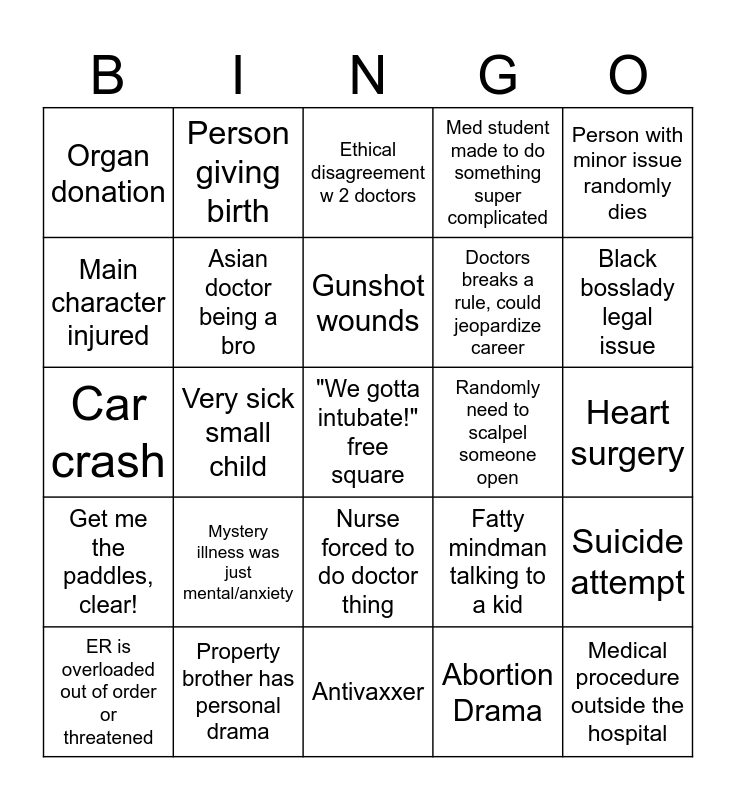 This bingo card has a free space and 24 words: Mystery illness was just mental/anxiety, Property brother has personal drama, Gunshot wounds, ER is overloaded out of order or threatened, Person with minor issue randomly dies, Organ donation, Main character injured, Person giving birth, Randomly need to scalpel someone open, Nurse forced to do doctor thing, Doctors breaks a rule, could jeopardize career, Car crash, Fatty mindman talking to a kid, Suicide attempt, Asian doctor being a bro, Abortion Drama, Heart surgery, Ethical disagreement w 2 doctors, Black bosslady legal issue, Very sick small child, Medical procedure outside the hospital, Get me the paddles, clear!, Med student made to do something super complicated and Antivaxxer.