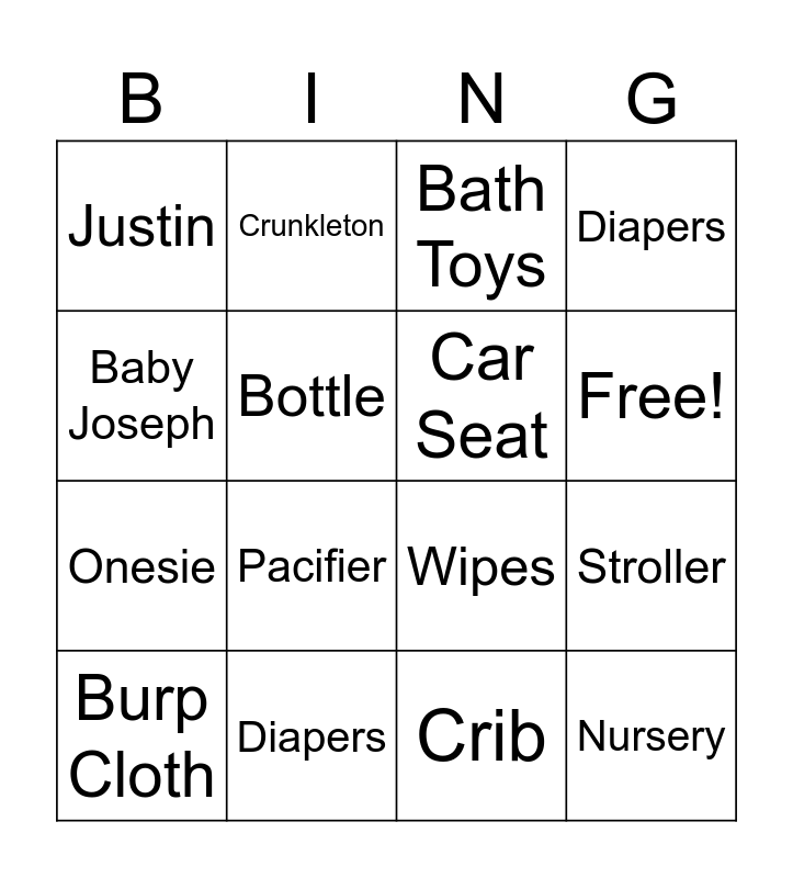This bingo card has 18 words: Pacifier, Nursery, Bath Toys, Justin, Wipes, Diapers, Burp Cloth, Crunkleton, Free!, Onesie, Crib, Baby Joseph, Stroller, Bottle, Car Seat, Kinsey, Diapers and Crib.