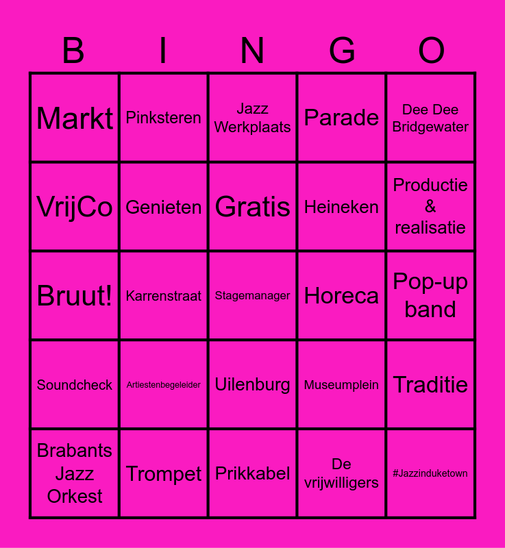 This bingo card has 46 words: Jazz in Duketown, Trompet, Saxofoon, De vrijwilligers, Pop-up band, 51ste keer, Pinksteren, Mandje laten zaken, Parade, Kerkplein, Markt, Karrenstraat, Uilenburg, Museumplein, Locatiemanager, Backstagemanager, Artiestenbegeleider, Stagemanager, Kidzzplein, Dee Dee Bridgewater, Bruut!, Marlon Pichel, Jazz Werkplaats, Heineken, D-reizen, VrijCo, Intake, Sponsoring, Horeca, Productie & realisatie, Communicatie, Blokkenschema, 22 t/m 24 mei 2026, Vrijwilligersdorp, Miles Davis, Soundcheck, Jazz, Prikkabel, Blokkenschema, Traditie, Brabants Jazz Orkest, Genieten, Gratis, De app, #Jazzinduketown and Applaus.
