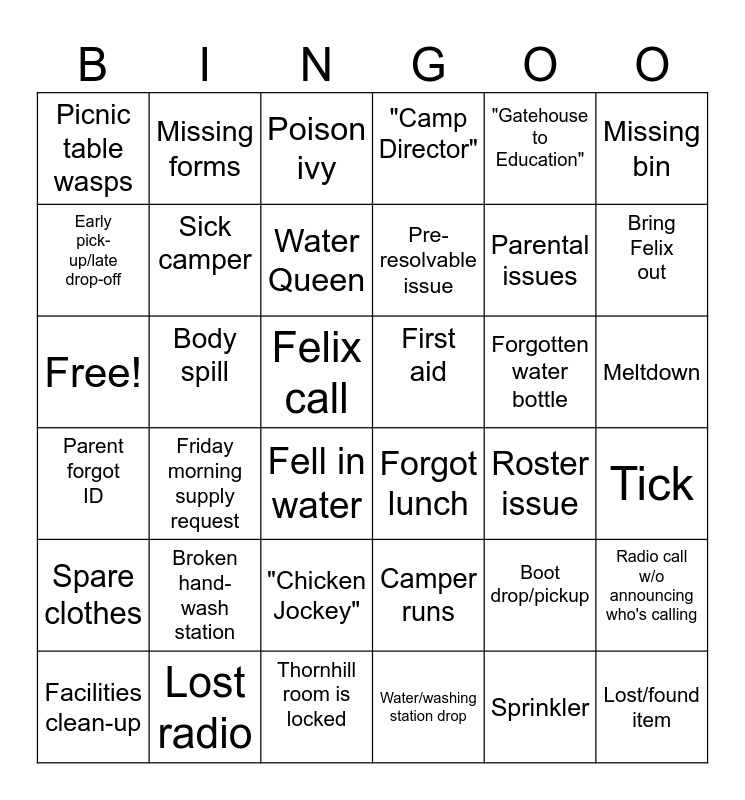 This bingo card has 36 words: Camper runs, "Chicken Jockey", Water/washing station drop, Early pick-up/late drop-off, Parent forgot ID, First aid, Sick camper, Thornhill room is locked, "Gatehouse to Education", Boot drop/pickup, Bring Felix out, "Camp Director", Radio call w/o announcing who's calling, Body spill, Pre-resolvable issue, Picnic table wasps, Spare clothes, Forgotten water bottle, Free!, Poison ivy, Felix call, Friday morning supply request, Forgot lunch, Fell in water, Roster issue, Missing forms, Parental issues, Lost radio, Water Queen, Missing bin, Lost/found item, Facilities clean-up, Tick, Meltdown, Broken hand-wash station and Sprinkler.