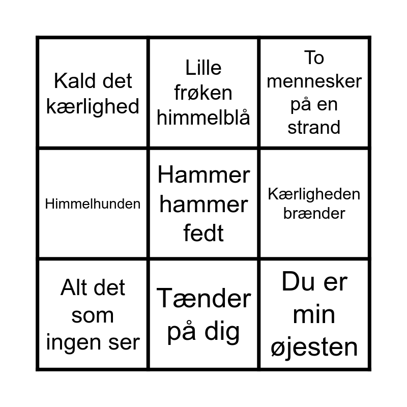 This bingo card has 42 words: Free!, Tænder på dig, Hvorfor går Louise til bal, Vi maler byen rød, Sexchikane, Pas på den knaldrøde gummibåd, Fut i fejemøget, Der står et billede af dig på mit bord, To mennesker på en strand, Lonnie fra Berlin, Hvor skal vi sove i nat, Sirenesangen, Susanne, Birgitte og Hanne, Hammer hammer fedt, Jeg ringer på fredag, Krøller eller ej, Karl Herman og jeg, Snakker med mig selv, Du burde købe dig en tyrolerhat, Lille frøken himmelblå, Kærligheden brænder, Smuk som et stjerneskud, Den røde tråd, Kald det kærlighed, I en lille båd der gynger, Er du dus med himlens fugle, Du er min øjesten, Gid du var i Skanderborg, Be bab a lu la, Under stjernerne på himlen, Kloden drejer, Sikke’n fest, Alt det som ingen ser, Sku’ du spørg’ fra no’en, Det’ det jeg altid har sagt, Sommer i Europa, Boom Boom, Men aldrig som før, Lidt Go’ musik, Det’ lige det, Himmelhunden and Hjerter af honning.