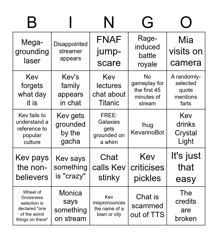 This bingo card has a free space and 24 words: Kev says something is "crazy", Monica says something on stream, Kev lectures chat about Titanic, Wheel of Grossness selection is declared "one of the worst things on there", Mia visits on camera, Mega-grounding laser, Kev forgets what day it is, Disappointed streamer appears, !hug KevarinoBot, Chat calls Kev stinky, No gameplay for the first 45 minutes of stream, Kev fails to understand a reference to popular culture, Kev criticises pickles, It's just that easy, Kev's family appears in chat, Chat is scammed out of TTS, Kev drinks Crystal Light, FNAF jump-scare, A randomly-selected quote mentions farts, Kev gets grounded by the gacha, The credits are broken, Kev pays the non-believers, Rage-induced battle royale and Kev mispronounces the name of a town or city.
