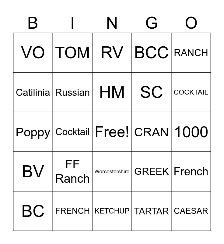 This bingo card has a free space and 24 words: FF Ranch, FRENCH, HM, BC, RANCH, VO, Catilinia, TOM, CRAN, Worcestershire, SC, Poppy, GREEK, French, Russian, TARTAR, 1000, RV, COCKTAIL, Cocktail, CAESAR, BV, BCC and KETCHUP.
