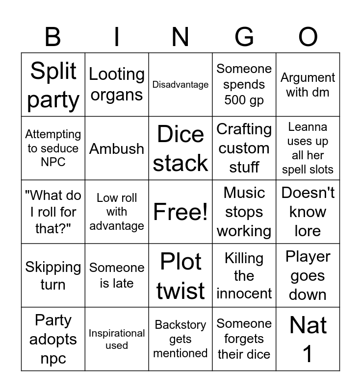 This bingo card has a free space and 45 words: Nat 20, Nat 1, Advantage, Party adopts npc, Sneak attack, Someone forgets their dice, Disadvantage, DM has to remind someone to add their modifiers, Argument with dm, Inspirational used, Someone spends 500 gp, Music stops working, Plot twist, Someone is late, Roll initiative, Backstory gets mentioned, Someone asks for irrelevant details, "What do I roll for that?", Players forget item they have in their inventory, Leanna uses up all her spell slots, Looting organs, Characters get drunk, Distracted player, Split party, Reference book, Doesn't know lore, 3 good rolls in a row, 3 bad rolls in a row, Killing the innocent, Skipping turn, Characters arguing, Player goes down, NPC betrays party, Spell goes ary, Failed saving throw, Low roll with advantage, Racist NPCs, Someone rolls on the floor, Stealing dice, Dice stack, Attempting to seduce NPC, Crafting custom stuff, Lying about class, Ambush and Teleport.