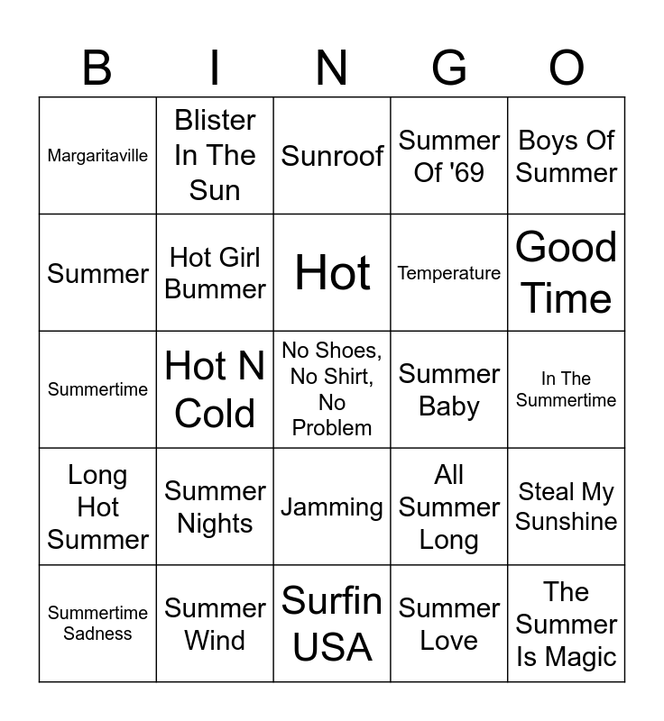 This bingo card has 35 words: Summertime Blues, Cruel Summer, RITMO, Hot Girl Bummer, Jamming, Summer Of '69, Summer, The Sun Is Gonna Rise Again, Hot, My Sweet Summer, Summertime, Boys Of Summer, Hot Stuff, Heat Waves, Margaritaville, Summer Baby, Summer Love, Hot N Cold, Long Hot Summer, No Shoes, No Shirt, No Problem, All Summer Long, Summertime Sadness, Steal My Sunshine, Summer Wind, Sunroof, Good Time, The Summer Is Magic, Fire Burning, Temperature, In The Summertime, Corona And Lime, Surfin USA, Summer Nights, Blister In The Sun and Toes.