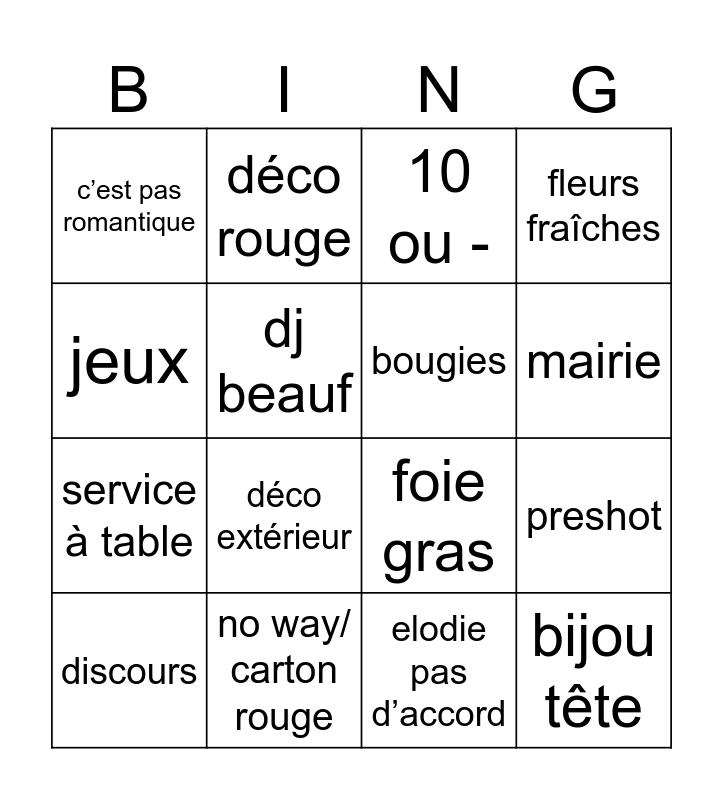 This bingo card has 16 words: no way/ carton rouge, preshot, 10 ou -, c’est pas romantique, service à table, déco rouge, foie gras, elodie pas d’accord, jeux, dj beauf, discours, fleurs fraîches, déco extérieur, mairie, bougies and bijou tête.