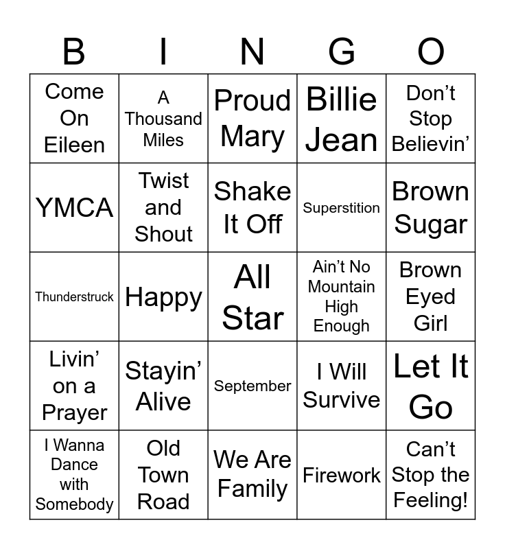 This bingo card has a free space and 39 words: Sweet Caroline, Dancing Queen, Uptown Funk, Twist and Shout, I Wanna Dance with Somebody, September, Shake It Off, Shout, Don’t Stop Believin’, Livin’ on a Prayer, Happy, Billie Jean, Can’t Stop the Feeling!, Brown Eyed Girl, Ain’t No Mountain High Enough, Stayin’ Alive, Hey Ya!, Come On Eileen, You’re the One That I Want, I Will Survive, YMCA, We Are Family, Superstition, Brown Sugar, Valerie, Walking on Sunshine, Footloose, Man! I Feel Like a Woman!, Bohemian Rhapsody, A Thousand Miles, Mr. Brightside, Wagon Wheel, Proud Mary, Old Town Road, Firework, Take On Me, Let It Go, Thunderstruck and Sugar, Sugar.