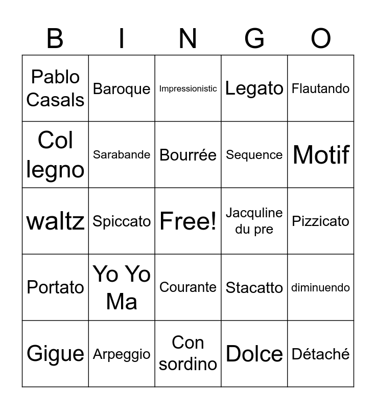 This bingo card has a free space and 39 words: Allemande, Arco, Gavotte, Sarabande, Gigue, Courante, Bourrée, Marcato, Flautando, Portato, Spiccato, Legato, Détaché, Pizzicato, Jacquline du pre, Yo Yo Ma, David Popper, Pablo Casals, Bach, Stacatto, Col legno, Con sordino, Sequence, Motif, Etude, Tail piece, End pin, The frog, f hole, Baroque, Classical, Romantic, Impressionistic, Arpeggio, Dolce, crescendo, diminuendo, waltz and minuet.