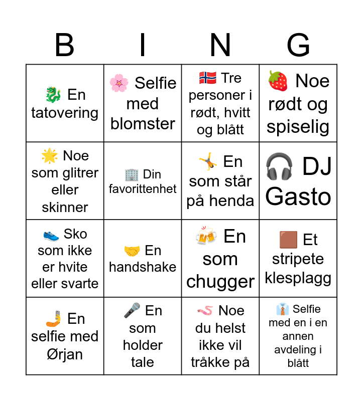 This bingo card has 37 words: 🧗 En tre-trinns menneskepyramide, 🍽️ En formelt foldet serviett, 👤 Din kjendis lookalike, 🤸 En som står på henda, 🥋 En fake slosskamp, 🦶 En tå, 🎧 DJ Gasto, 🧓 En som har jobbet i EY lengre enn deg, 🌟 Noe som glitrer eller skinner, 👶 En som har fått baby i 2025, 🟫 Et stripete klesplagg, 🍓 Noe rødt og spiselig, 🤳 En selfie med Ørjan, 🪱 Noe du helst ikke vil tråkke på, 🏢 Din favorittenhet, 👔 Selfie med en i en annen avdeling i blått, 🥂 En skål (cheers), 🇳🇴 Tre personer i rødt, hvitt og blått, 🌊 En bølge, 🎤 En som holder tale, 🐉 En tatovering, 🤝 En handshake, 👯 To stk som har helt lik outfit, 💍 Tre gifteringer, 🔤 Noe som starter på R, 😬 En grimase, 🌸 Selfie med blomster, 📸 Et gruppebilde, 🔤 Noe som starter på K, 💔 En som er singel, 🏃♀️ Noen som gjør "BAYWATCH - løp", 🌿 Gress, 🍻 En som chugger, 🌭 En pølse, ❤️ Et hjerte, 👟 Sko som ikke er hvite eller svarte and 🧍♀️ Selfie med en i soskom.