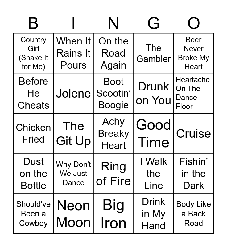 This bingo card has 35 words: In Case You Didn't Know, Friends in Low Places, Take Me Home, Country Roads, Jolene, Ring of Fire, The Gambler, Before He Cheats, Need You Now, Boot Scootin’ Boogie, Crazy, Chicken Fried, Beer Never Broke My Heart, Tennessee Whiskey, Wagon Wheel, Country Girl (Shake It for Me), Good Time, Drink in My Hand, The Git Up, Dust on the Bottle, Achy Breaky Heart, I Walk the Line, Should've Been a Cowboy, Fishin’ in the Dark, Neon Moon, On the Road Again, Heartache On The Dance Floor, Body Like a Back Road, This Kiss, Drunk on You, Cruise, Behind the Clouds, Big Iron, Why Don't We Just Dance, When It Rains It Pours and I Had Some Help.