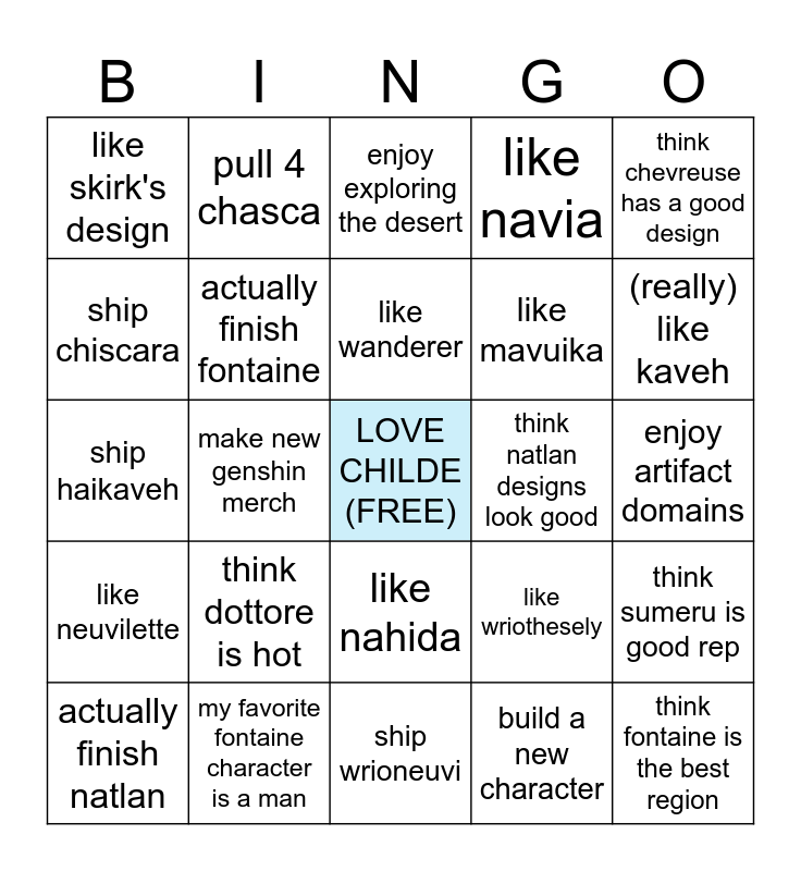 This bingo card has a free space and 24 words: think dottore is hot, my favorite fontaine character is a man, like wanderer, actually finish natlan, think chevreuse has a good design, like skirk's design, ship chiscara, pull 4 chasca, think natlan designs look good, like nahida, like mavuika, ship haikaveh, like wriothesely, think sumeru is good rep, actually finish fontaine, build a new character, enjoy artifact domains, enjoy exploring the desert, (really) like kaveh, make new genshin merch, think fontaine is the best region, like neuvilette, like navia and ship wrioneuvi.