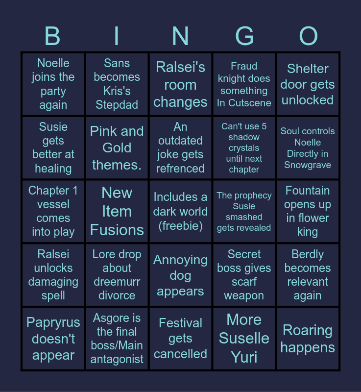 This bingo card has a free space and 24 words: Lore drop about dreemurr divorce, Asgore is the final boss/Main antagonist, An outdated joke gets refrenced, Papryrus doesn't appear, Shelter door gets unlocked, Noelle joins the party again, Susie gets better at healing, Sans becomes Kris's Stepdad, The prophecy Susie smashed gets revealed, Annoying dog appears, Can't use 5 shadow crystals until next chapter, Chapter 1 vessel comes into play, Secret boss gives scarf weapon, Berdly becomes relevant again, Pink and Gold themes., More Suselle Yuri, Fountain opens up in flower king, Ralsei's room changes, Soul controls Noelle Directly in Snowgrave, New Item Fusions, Roaring happens, Ralsei unlocks damaging spell, Fraud knight does something In Cutscene and Festival gets cancelled.