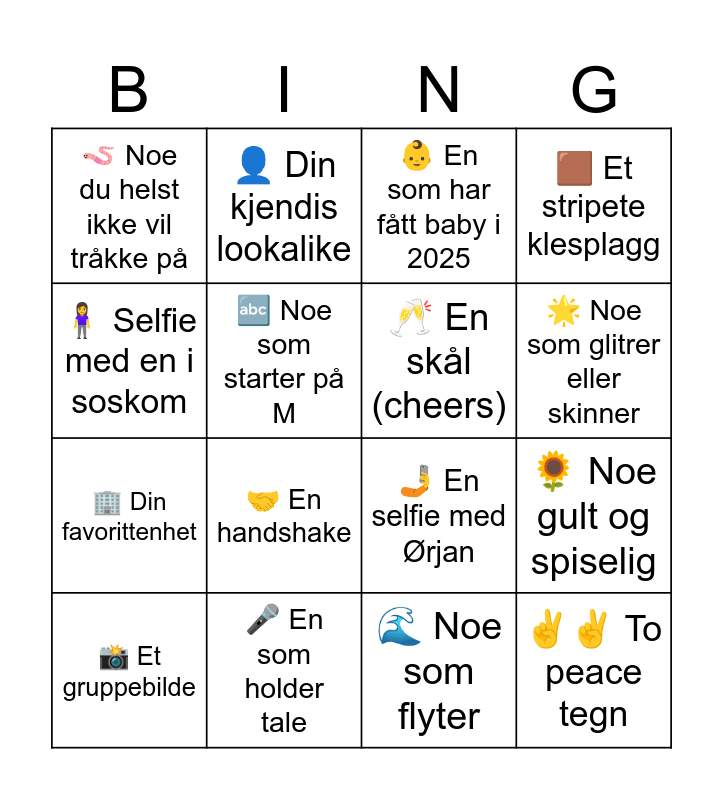 This bingo card has 25 words: 👯 To stk som har helt lik outfit, 👟 Sko som ikke er hvite eller svarte, 🌟 Noe som glitrer eller skinner, 🍻 En som chugger, 🧍♀️ Selfie med en i soskom, 🪱 Noe du helst ikke vil tråkke på, 🔤 Noe som starter på M, 👤 Din kjendis lookalike, 🎤 En som holder tale, 💍 Tre gifteringer, 🏢 Din favorittenhet, 🤳 En selfie med Ørjan, 🇳🇴 Tre personer i rødt, hvitt og blått, 🔤 Noe som starter på N, 🥂 En skål (cheers), 🐉 En tatovering, 🌊 Noe som flyter, 👶 En som har fått baby i 2025, 🤝 En handshake, 🌻 Noe gult og spiselig, 📸 Et gruppebilde, 🕶️ To med solbriller, ✌️✌️ To peace tegn, 🟫 Et stripete klesplagg and 🚜 En låve.