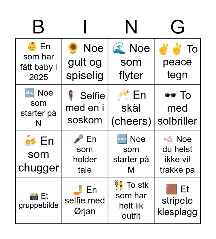 This bingo card has 24 words: En låve, 👟 Sko som ikke er hvite eller svarte, 🕶️ To med solbriller, 🌟 Noe som glitrer eller skinner, 🔤 Noe som starter på N, 👶 En som har fått baby i 2025, 🧍♀️ Selfie med en i soskom, 🌻 Noe gult og spiselig, 🤳 En selfie med Ørjan, 🤝 En handshake, 🍻 En som chugger, 🔤 Noe som starter på M, 👤 Din kjendis lookalike, 💍 Tre gifteringer, 🥂 En skål (cheers), 🇳🇴 Tre personer i rødt, hvitt og blått, 👯 To stk som har helt lik outfit, 🌊 Noe som flyter, 🎤 En som holder tale, 🪱 Noe du helst ikke vil tråkke på, 📸 Et gruppebilde, 🟫 Et stripete klesplagg, ✌️✌️ To peace tegn and 🏢 Din favorittenhet.