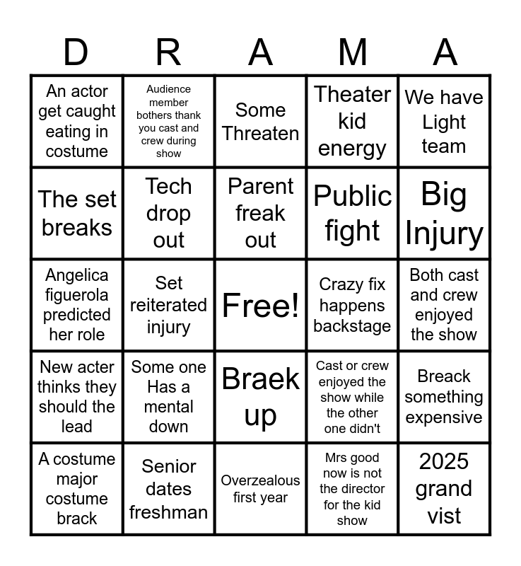 This bingo card has a free space and 24 words: Some one Has a mental down, Senior dates freshman, Parent freak out, A costume major costume brack, We have Light team, An actor get caught eating in costume, The set breaks, Audience member bothers thank you cast and crew during show, Crazy fix happens backstage, Braek up, Public fight, Angelica figuerola predicted her role, Cast or crew enjoyed the show while the other one didn't, Breack something expensive, Tech drop out, Mrs good now is not the director for the kid show, Both cast and crew enjoyed the show, Some Threaten, Big Injury, Set reiterated injury, 2025 grand vist, New acter thinks they should the lead, Theater kid energy and Overzealous first year.