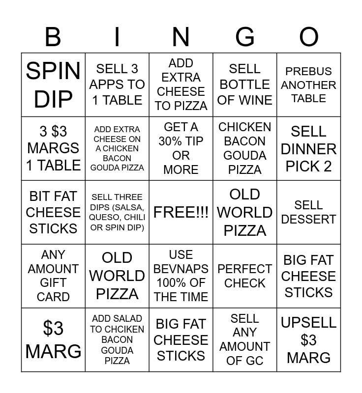 This bingo card has a free space and 24 words: OLD WORLD PIZZA, ADD SALAD TO CHCIKEN BACON GOUDA PIZZA, GET A 30% TIP OR MORE, $3 MARG, PREBUS ANOTHER TABLE, SPIN DIP, 3 $3 MARGS 1 TABLE, SELL 3 APPS TO 1 TABLE, OLD WORLD PIZZA, USE BEVNAPS 100% OF THE TIME, CHICKEN BACON GOUDA PIZZA, BIT FAT CHEESE STICKS, PERFECT CHECK, BIG FAT CHEESE STICKS, ADD EXTRA CHEESE ON A CHICKEN BACON GOUDA PIZZA, SELL ANY AMOUNT OF GC, SELL DESSERT, ADD EXTRA CHEESE TO PIZZA, SELL DINNER PICK 2, SELL THREE DIPS (SALSA, QUESO, CHILI OR SPIN DIP), UPSELL $3 MARG, ANY AMOUNT GIFT CARD, SELL BOTTLE OF WINE and BIG FAT CHEESE STICKS.