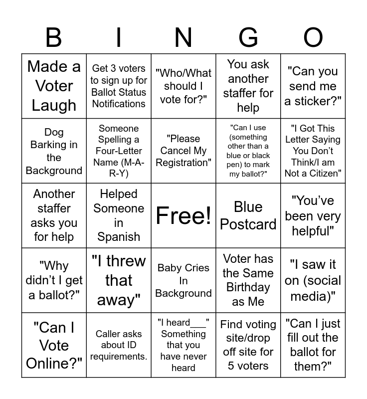 This bingo card has a free space and 24 words: "I threw that away", Caller asks about ID requirements., "Please Cancel My Registration", "Can I Vote Online?", "Can you send me a sticker?", Made a Voter Laugh, Dog Barking in the Background, Get 3 voters to sign up for Ballot Status Notifications, Blue Postcard, Baby Cries In Background, "Can I use (something other than a blue or black pen) to mark my ballot?", Another staffer asks you for help, Voter has the Same Birthday as Me, "I saw it on (social media)", Someone Spelling a Four-Letter Name (M-A-R-Y), Find voting site/drop off site for 5 voters, "You’ve been very helpful", "Who/What should I vote for?", "I Got This Letter Saying You Don’t Think/I am Not a Citizen", Helped Someone in Spanish, "Can I just fill out the ballot for them?", "Why didn’t I get a ballot?", You ask another staffer for help and "I heard___" Something that you have never heard.