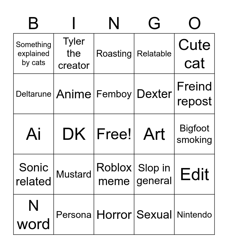 This bingo card has a free space and 24 words: Mustard, Persona, Femboy, N word, Cute cat, Something explained by cats, Deltarune, Tyler the creator, Art, Roblox meme, Dexter, Ai, Slop in general, Edit, Anime, Sexual, Bigfoot smoking, Roasting, Freind repost, DK, Nintendo, Sonic related, Relatable and Horror.
