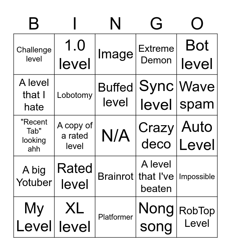 This bingo card has a free space and 24 words: Rated level, XL level, Buffed level, My Level, Bot level, Challenge level, A level that I hate, 1.0 level, Crazy deco, Brainrot, Sync level, "Recent Tab" looking ahh, A level that I've beaten, Impossible, Lobotomy, Nong song, Auto Level, Image, Wave spam, A copy of a rated level, RobTop Level, A big Yotuber, Extreme Demon and Platformer.