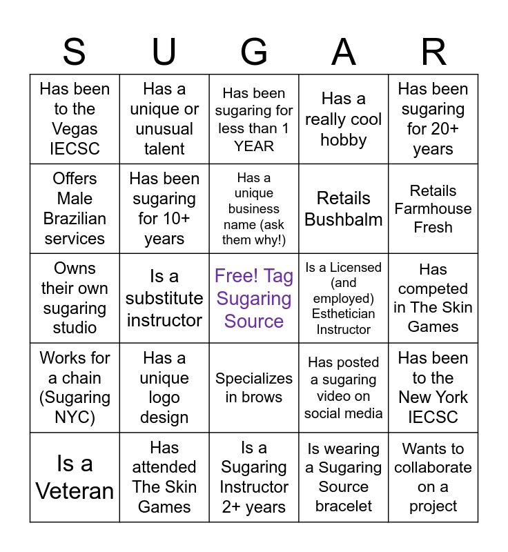 This bingo card has a free space and 24 words: Has a unique logo design, Has attended The Skin Games, Has a unique business name (ask them why!), Is a Veteran, Has been sugaring for 20+ years, Has been to the Vegas IECSC, Offers Male Brazilian services, Has a unique or unusual talent, Is a Licensed (and employed) Esthetician Instructor, Specializes in brows, Retails Bushbalm, Owns their own sugaring studio, Has posted a sugaring video on social media, Has been to the New York IECSC, Has been sugaring for 10+ years, Is wearing a Sugaring Source bracelet, Has competed in The Skin Games, Has been sugaring for less than 1 YEAR, Retails Farmhouse Fresh, Is a substitute instructor, Wants to collaborate on a project, Works for a chain (Sugaring NYC), Has a really cool hobby and Is a Sugaring Instructor 2+ years.
