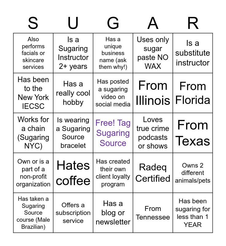 This bingo card has a free space and 75 words: Has a unique logo design, Has attended The Skin Games, Has a unique business name (ask them why!), Is a Veteran, Has been sugaring for 20+ years, Has been to the Vegas IECSC, Offers Male Brazilian services, Has a unique or unusual talent, Is a Licensed (and employed) Esthetician Instructor, Specializes in brows, Retails Bushbalm, Owns their own sugaring studio, Has posted a sugaring video on social media, Has been to the New York IECSC, Has been sugaring for 10+ years, Is wearing a Sugaring Source bracelet, Has competed in The Skin Games, Has been sugaring for less than 1 YEAR, Retails Farmhouse Fresh, Is a substitute instructor, Wants to collaborate on a project, Works for a chain (Sugaring NYC), Has a really cool hobby, Is a Sugaring Instructor 2+ years, Uses only sugar paste NO WAX, Tamara’s Pro Certified, Alexandria Certified, SugarSmac Certification, Sweet & True Certified, KeKo Certified, Online Certified, Brand Neutral Certified (Sarah, Jamie, Dalia), Self Taught, Radeq Certified, From Florida, From Illinois, From Washington, From Oregon, From Texas, From Tennessee, From California, From Minnesota, From Missouri, From Ohio, From Louisiana, Not from the States at all!, Has taken a Sugaring Source course (Male Brazilian), Also performs facials or skincare services, Recently raised their service prices, Can name their favorite backbar product, Gets most of their bookings via Instagram or DMs, Has created their own client loyalty program, Wants to mentor a newer esthetician, Offers a pre-booking discount or package deals, Has worked a pop-up or event booth before, Created a viral or educational reel on social media, Has rebranded their business at least once, Specializes in intimate skin treatments, Offers mobile services, Is a morning person who loves early appointments, Hates coffee, Has a dream vacation destination picked out, Speaks more than one language, Owns more skincare than makeup, Started their business with less than $1,000, Loves true crime podcasts or shows, Has a tattoo that’s meaningful or spontaneous, Used to work in a completely different career, Loves creating playlists for the treatment room, Owns 2 different animals/pets, Own or is a part of a non-profit organization, Offers a subscription service, Sells handmade products, Has a blog or newsletter and Has a unique logo design.