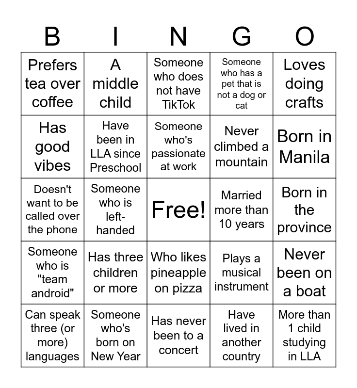 This bingo card has a free space and 24 words: Can speak three (or more) languages, Has three children or more, Someone who's passionate at work, Have lived in another country, Loves doing crafts, Prefers tea over coffee, A middle child, Someone who does not have TikTok, Married more than 10 years, Born in the province, Doesn't want to be called over the phone, Have been in LLA since Preschool, Plays a musical instrument, Never been on a boat, Has good vibes, Someone who's born on New Year, Has never been to a concert, Someone who has a pet that is not a dog or cat, Born in Manila, Someone who is "team android", Someone who is left-handed, Who likes pineapple on pizza, Never climbed a mountain and More than 1 child studying in LLA.
