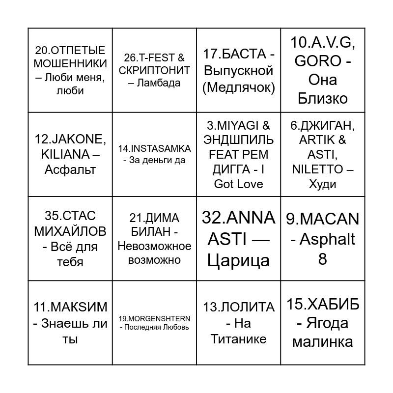 This bingo card has 37 words: Free!, 1.ЕГОР КРИД – Невеста, 2.RAMIL' – Сияй, 3.MIYAGI & ЭНДШПИЛЬ FEAT РЕМ ДИГГА - I Got Love, 4.ФИЛИПП КИРКОРОВ - Я эту жизнь тебе отдам, 5.ТАТЬЯНА КУРТУКОВА – Матушка, 6.ДЖИГАН, ARTIK & ASTI, NILETTO – Худи, 7.ANNA ASTI - По барам, 12.JAKONE, KILIANA – Асфальт, 8.ЖЕНЯ ТРОФИМОВ & КОМНАТА КУЛЬТУРЫ — Поезда, 9.MACAN - Asphalt 8, 10.A.V.G, GORO - Она Близко, 11.МАКSИМ - Знаешь ли ты, 13.ЛОЛИТА - На Титанике, 14.INSTASAMKA - За деньги да, 15.ХАБИБ - Ягода малинка, 16.БАНД'ЭРОС - Коламбия Пикчерз, 17.БАСТА - Выпускной (Медлячок), 18.ТИМАТИ, DJ DLEE - В клубе, 19.MORGENSHTERN - Последняя Любовь, 20.ОТПЕТЫЕ МОШЕННИКИ – Люби меня, люби, 21.ДИМА БИЛАН - Невозможное возможно, 22.ЛЮСЯ ЧЕБОТИНА - Солнце Монако, 23.FEDUK & ЭЛДЖЕЙ - Розовое вино, 24.МАКС КОРЖ - Жить в кайф, 25.KIZARU, ICEGERGERT — Fake ID, 26.T-FEST & СКРИПТОНИТ – Ламбада, 27.БУМБОКС – Вахтерам, 28.ГЛЮК`OZА – Невеста, 29.BETSY, МАРИЯ ЯНКОВСКАЯ – Sigma Boy, 30.GAYAZOV$ BROTHER$ — Малиновая лада, 31.РУКИ ВВЕРХ - Крошка моя, 32.ANNA ASTI — Царица, 33.ВАЛЕРИЙ МЕЛАДЗЕ - Салют, Вера, 34.ВЕРА БРЕЖНЕВА - Любовь спасет мир, 35.СТАС МИХАЙЛОВ - Всё для тебя and 36.КЛАВА КОКА & MORGENSHTERN - Мне пох.