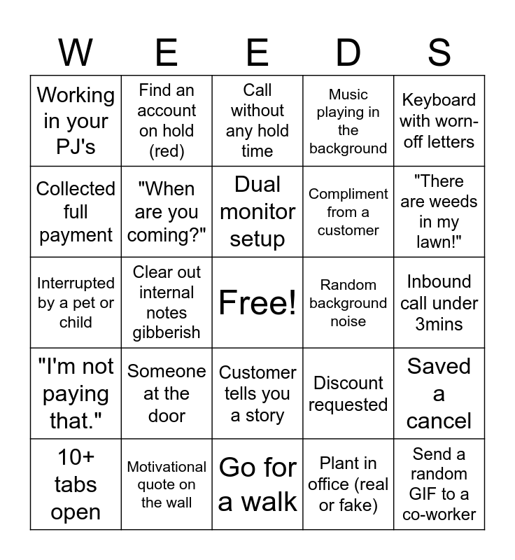 This bingo card has a free space and 24 words: Someone at the door, Motivational quote on the wall, Dual monitor setup, 10+ tabs open, Keyboard with worn-off letters, Working in your PJ's, Collected full payment, Find an account on hold (red), Random background noise, Customer tells you a story, Compliment from a customer, Interrupted by a pet or child, Discount requested, Saved a cancel, "When are you coming?", Plant in office (real or fake), Inbound call under 3mins, Call without any hold time, "There are weeds in my lawn!", Clear out internal notes gibberish, Send a random GIF to a co-worker, "I'm not paying that.", Music playing in the background and Go for a walk.