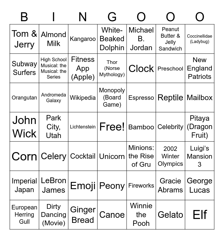 This bingo card has a free space and 49 words: Gracie Abrams, Preschool, Winnie the Pooh, Park City, Utah, Wikipedia, Pitaya (Dragon Fruit), Almond Milk, Ginger Bread, Peanut Butter & Jelly Sandwich, Unicorn, Coccinellidae (Ladybug), White-Beaked Dolphin, Reptile, Espresso, LeBron James, Celebrity, Subway Surfers, New England Patriots, George Lucas, Michael B. Jordan, Clock, Lichtenstein, Tom & Jerry, High School Musical: the Musical: the Series, European Herring Gull, Fitness App (Apple), Mailbox, Dirty Dancing (Movie), Monopoly (Board Game), Andromeda Galaxy, Hubble Telescope, Bamboo, Imperial Japan, Emoji, John Wick, Minions: the Rise of Gru, 2002 Winter Olympics, Luigi’s Mansion 3, Orangutan, Cocktail, Peony, Corn, Elf, Canoe, Thor (Norse Mythology), Kangaroo, Fireworks, Celery and Gelato.