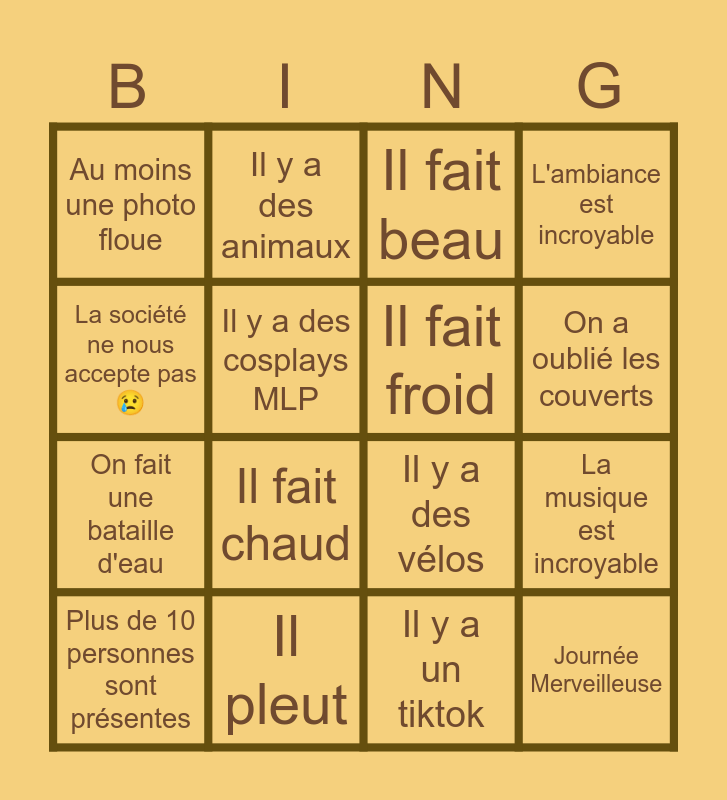 This bingo card has 16 words: Plus de 10 personnes sont présentes, Il pleut, Il fait beau, L'ambiance est incroyable, La société ne nous accepte pas 😢, Il y a des animaux, Il y a des vélos, La musique est incroyable, Au moins une photo floue, Il y a des cosplays MLP, Il y a un tiktok, On a oublié les couverts, On fait une bataille d'eau, Il fait chaud, Il fait froid and Journée Merveilleuse.